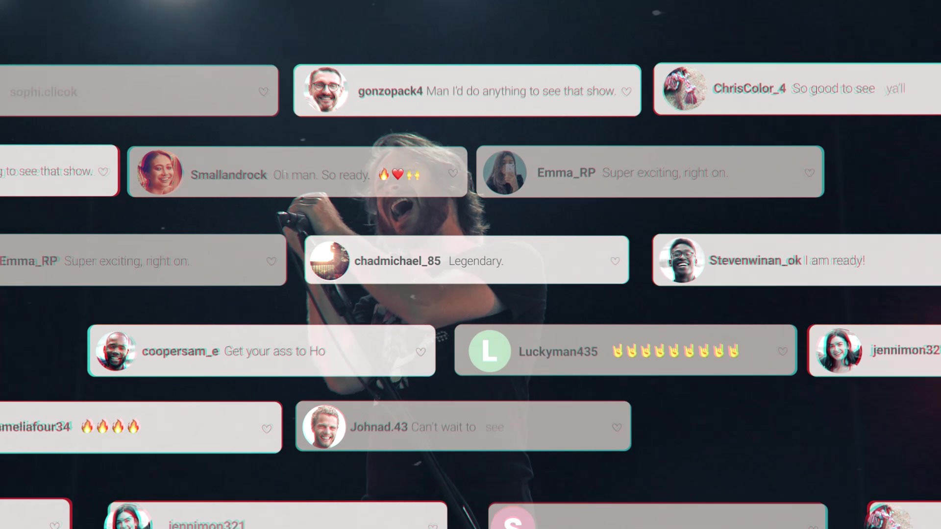 To highlight the fans' voices, we curated social media posts that resonated with the tour’s spirit—energy, freshness, and a rock-and-roll vibe—and integrated them as dynamic overlays on live footage. This approach placed the fans front and center, almost as if they were on stage alongside the band.